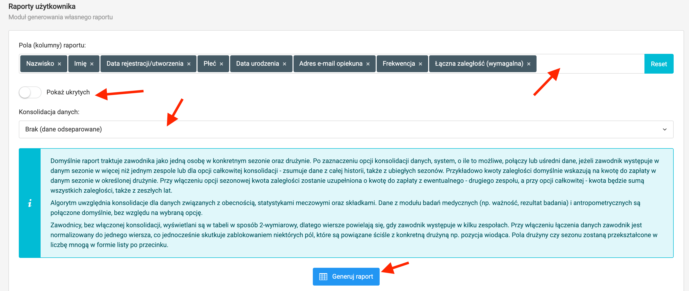 Aby przygotować własny raport, wpisz do pola (kolumny) raportu, kolejne dane, które chcesz dodać do raportu. Po zakończeniu dodawania kolejnych kolumn raportu, możesz ustalić dwie dodatkowe kwestie. Pierwsza, to czy raport ma uwzględniać zawodników ukrytych, natomiast druga, to konsolidacja danych. W tym miejscu zadecydujesz czy pobierane do raportu dane zawodnika, mają dotyczyć tylko jednego sezonu, jednej drużyny czy też zbiorczo wszystkich danych dotyczących danego zawodnika.