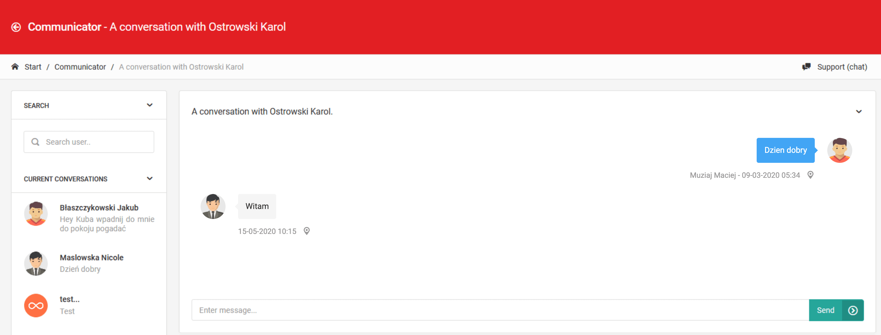 Tanto no aplicativo móvel quanto no navegador web, há um mensageiro disponível que permite a comunicação entre os usuários do sistema. Existem dois modos de conversa disponíveis - privada (1 para 1) e conversa em grupo, na qual mais usuários podem participar.
