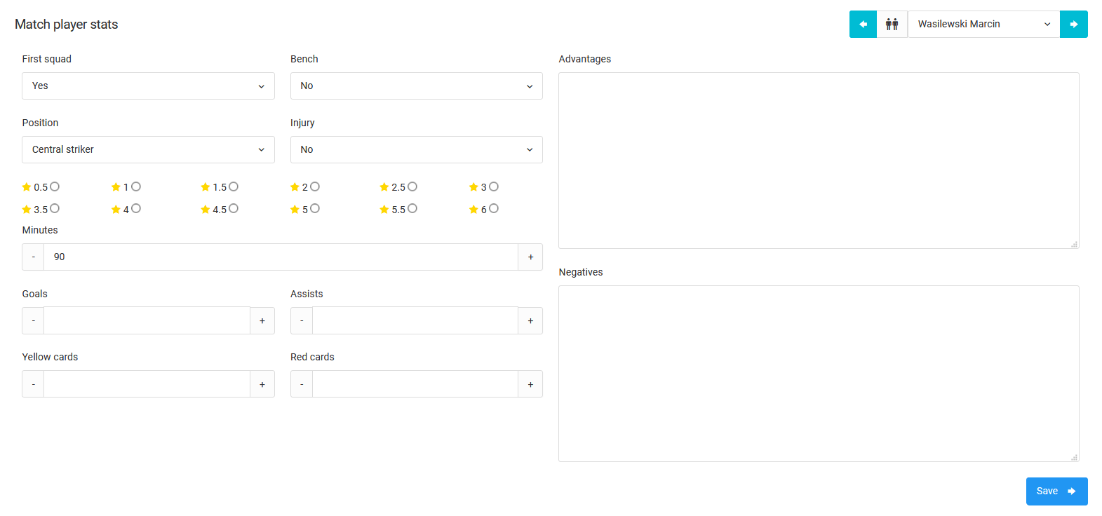Como você pode ver na imagem acima, você pode inserir manualmente as estatísticas individuais dos jogadores. Além dos elementos básicos como gols marcados ou pontos marcados, você pode adicionar informações sobre os minutos em campo, assistências e penalidades. Além disso, você pode avaliar um jogador por seu desempenho na partida e descrever os prós e contras de sua atuação na partida. O resultado final das estatísticas da partida preenchidas é um relatório completo da partida.