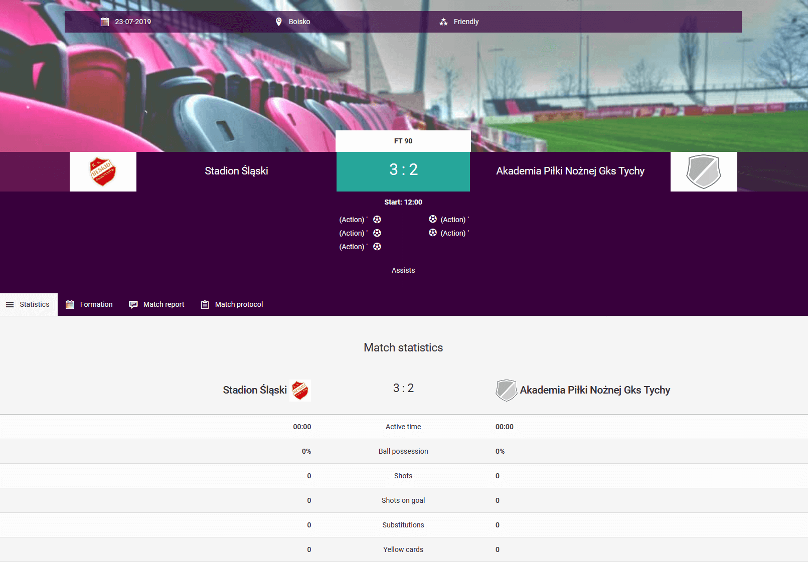 Esta função é muito útil para preencher os resultados de partidas com muitos gols ou em esportes onde muitos pontos são marcados. Para evitar o preenchimento de protocolos de partida extremamente longos com um resultado de 22-3 e substituições, vale a pena preencher as estatísticas individuais dos jogadores. Para acessá-las, vá ao calendário e selecione "Estatísticas do jogador na partida" no menu da partida.
