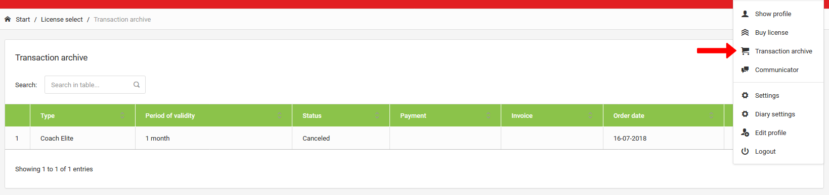 Para pagamentos individuais, você tem acesso ao arquivo de todas as suas transações. Para acessar o arquivo, clique em seu nome no canto direito da tela, depois selecione "arquivo de transações" no menu.